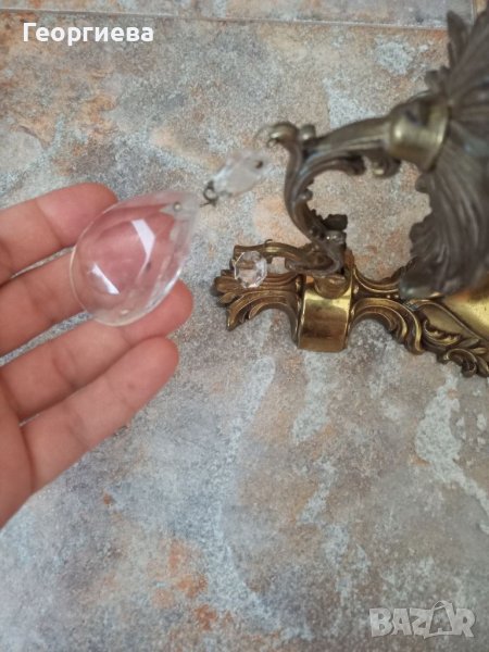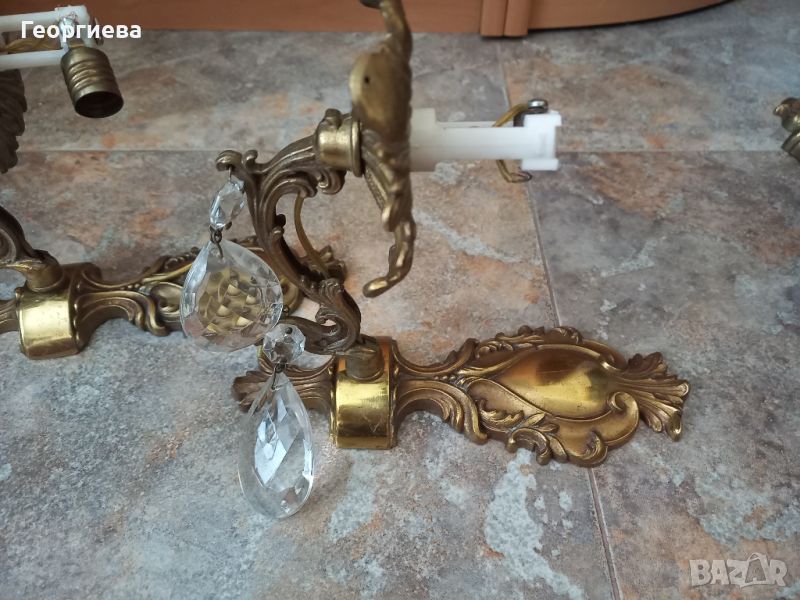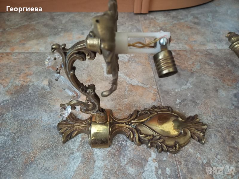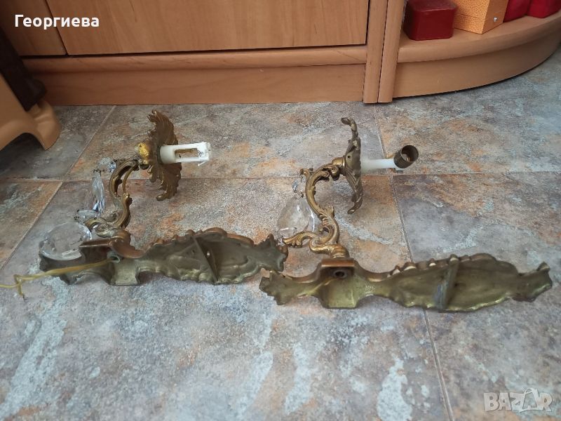 Два аплика от месинг. Липсва единият стъклен елемент. Размерите са 18.5 см. Цената им е 70 лв.