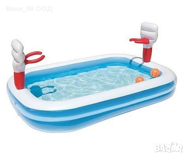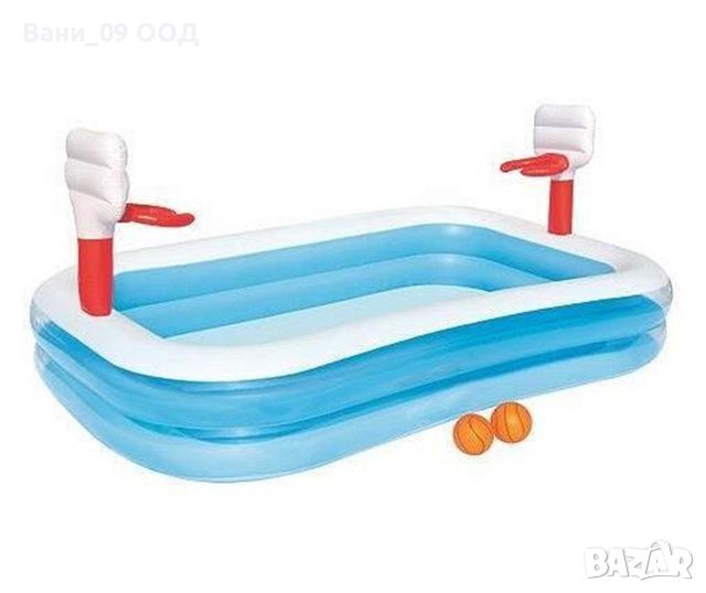 Басейнът е оборудван с два коша и две надуваеми топки.