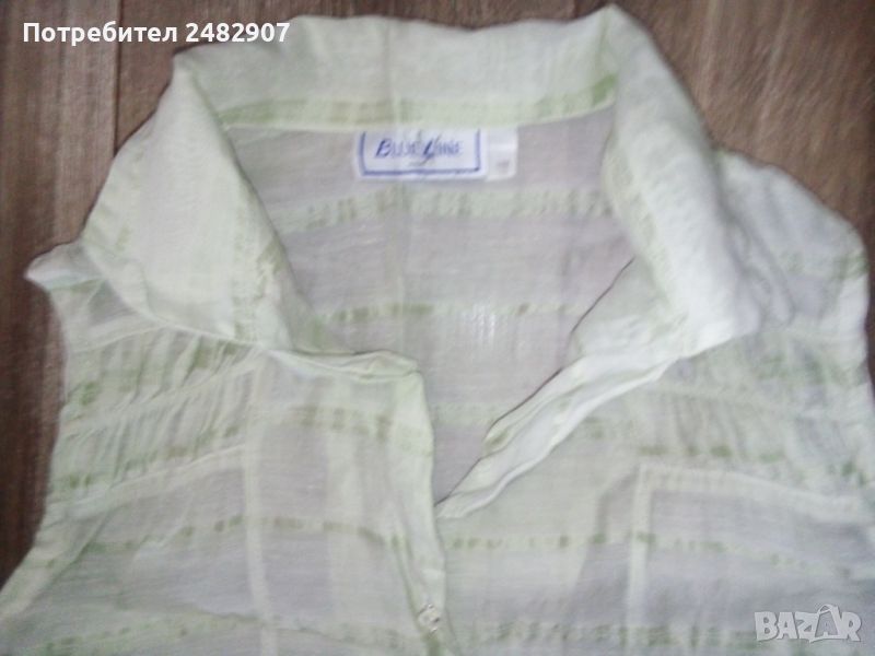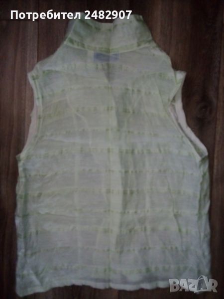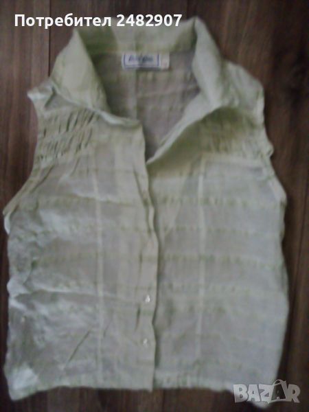 Дамска лятна риза без ръкави в бледо зелено, размер S. Ширина в раменете - 35 см, ширина под мишниците - 45 см, ширина в долната част - 46 см, дължина от рамото до долу - 54 см. Много запазена, почти не е използвана, тънка, полупрозрачна, закопчаване с 4 броя малки прозрачни копчета.