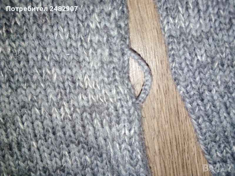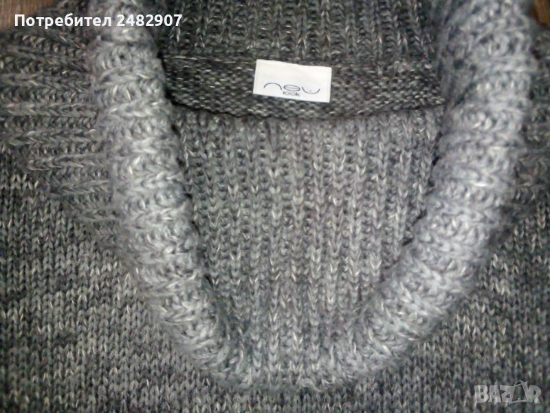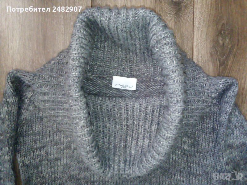 Машинно плетена дамска туника, цвят - сив меланж, размер S с голяма поло яка. Ширина под мишниците - 44 см, ширина в долната част - 47 см, дължина от деколтето до долу - 73 см, дължина на ръкава от деколтето - 68 см, ширина на ръкава в долната част - 12 см, височина на полото - 33 см, ширина на полото - 38 см. Много запазена, почти не е използвана, с две гайки на талията.