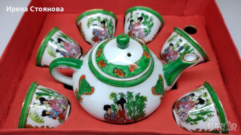 Китайско миниатюрно сервизче Zhong Guo Jingdezhen Zhi, 1980 г. Изрисувани гейши, наситени цветове. Общо 9 части в кутия, на места фабрични зацапвания или пропуск боя, леко протриваме на злато при чучура.