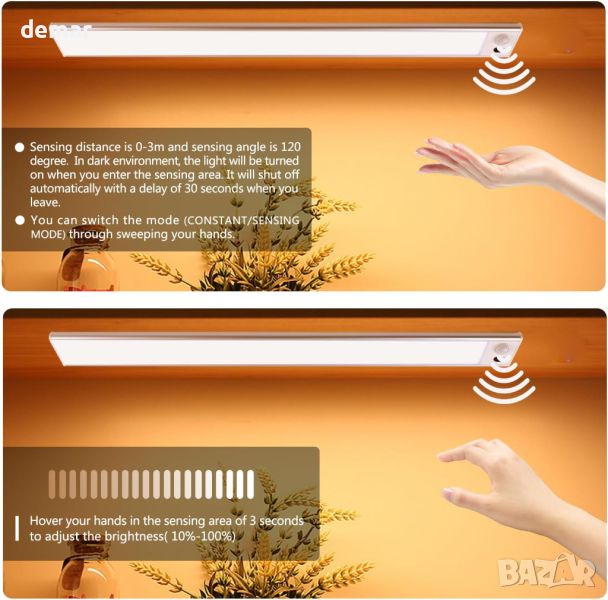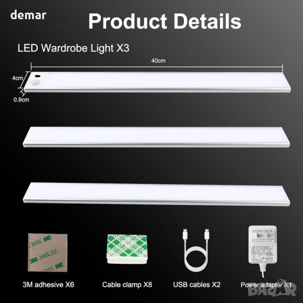 Този продукт включва 77 светодиода с висока яркост, доставящи 1140 лумена (3 бр.) с дневна бяла светлина от 6000K, идеални за осветяване на кухненски шкафове, гаражи, рафтове, килери, бюра, работни маси и стълби. Стабилният кабелен дизайн включва основна контролна лампа и две допълнителни лампи, свързани чрез кабели TYPE-C, захранвани от 24V DC адаптер за надеждна работа и дълготрайност. Той има режим на разпознаване на човешкото тяло, който активира светлината в рамките на 0-3 m, 120-градусов диапазон, и индукция с ръка за лесен контрол. Ултратънкият 9-милиметров профил позволява дискретно монтиране с включени двустранни ленти и кабелни скоби за универсален монтаж.