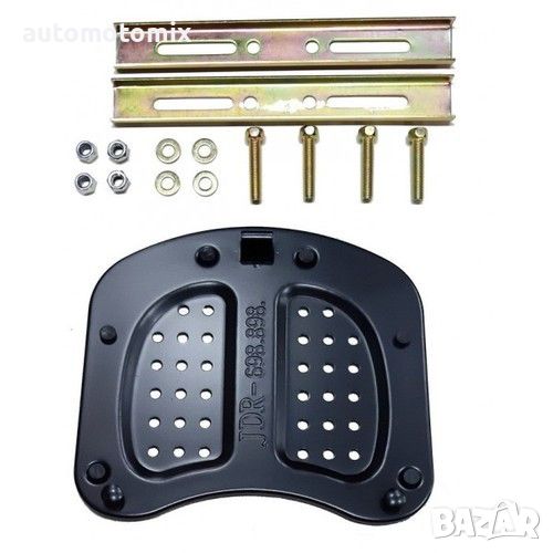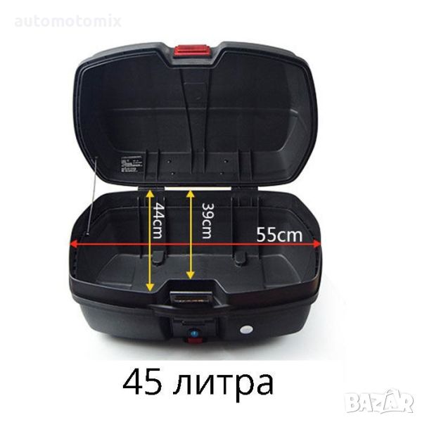 Пластмасов куфар (кутия) за багажник - за скутер или мотор. Универсален монтаж. Изчистен и функционален дизайн с вграден червен светлоотразител. Приложен универсален комплект за закрепване към почти всякакъв тип багажник. Вместимост : 45л Комплекта включва:2броя ключове + 1брой-метална скара за закрепване и всичко необходими крепежни елементи за бърз и лесен монтаж. Страхотна изработка със заключващ механизъм. Куфара разполага с удобна дръжка за пренасяне. Лесен монтаж и демонтаж на скарата. Цвят на куфара:Черен