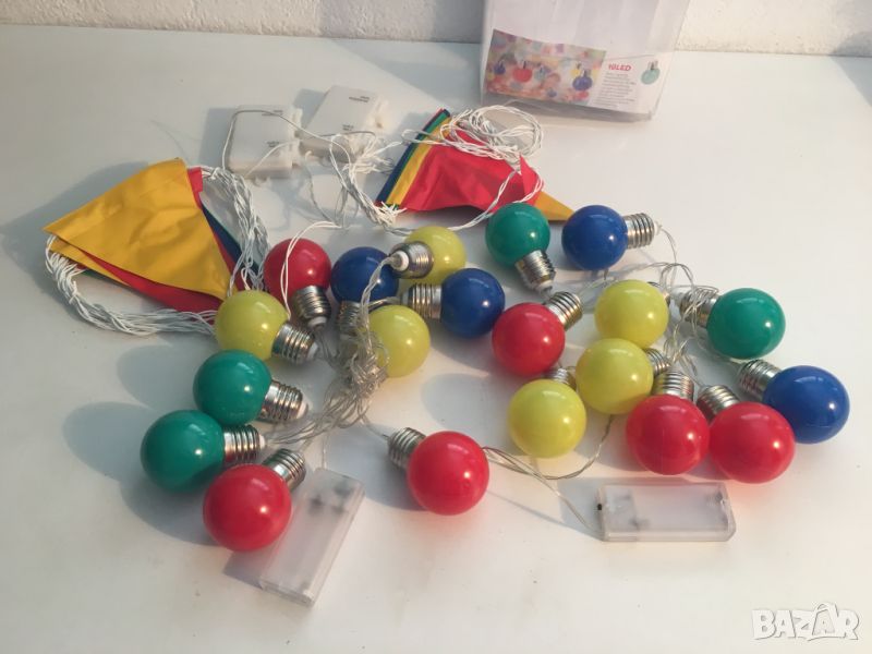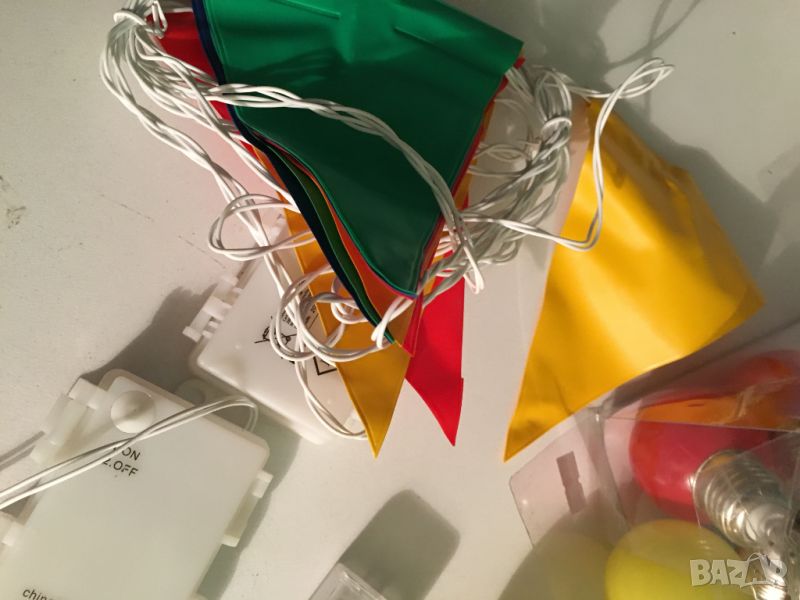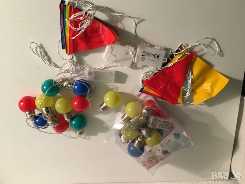 нови, не са използвани, но липсват оригиналните опаковки. два герлянда топки и два герлянда знаменца. в комплекта не са включени батерии. за въпроси и поръчка на лично съобщение.