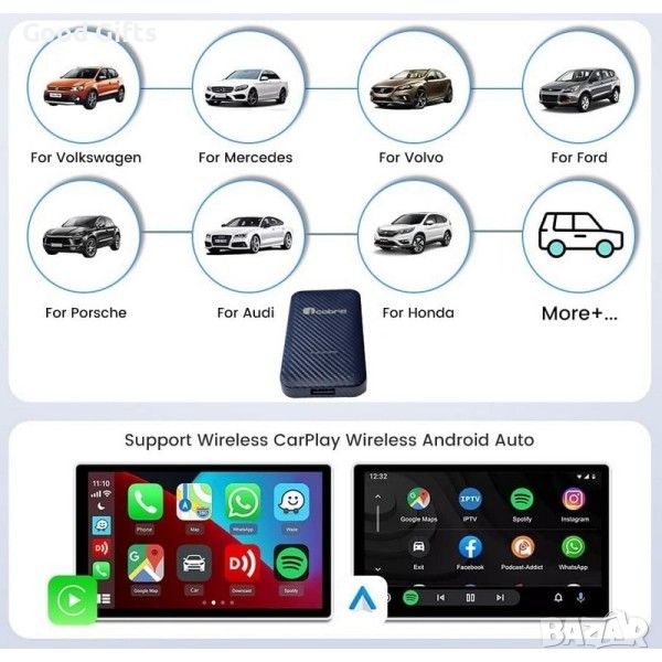 Безжичен USB адаптер, съвместим с Apple Carplay и Android Auto, за автомобили с ВГРАДЕНИ от производителя на автомобила Apple CarPlay и/или Android Auto системи.