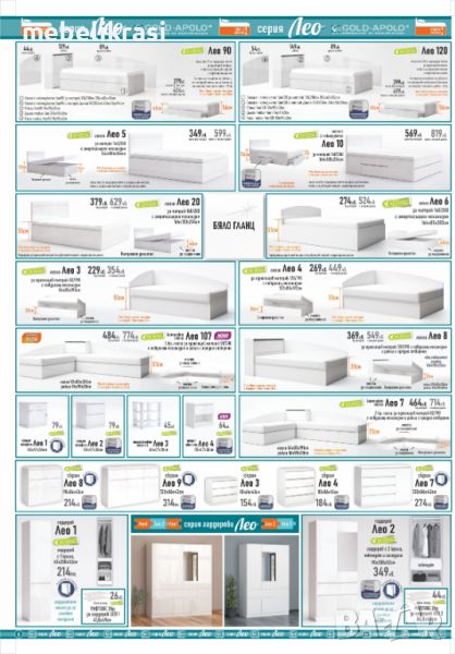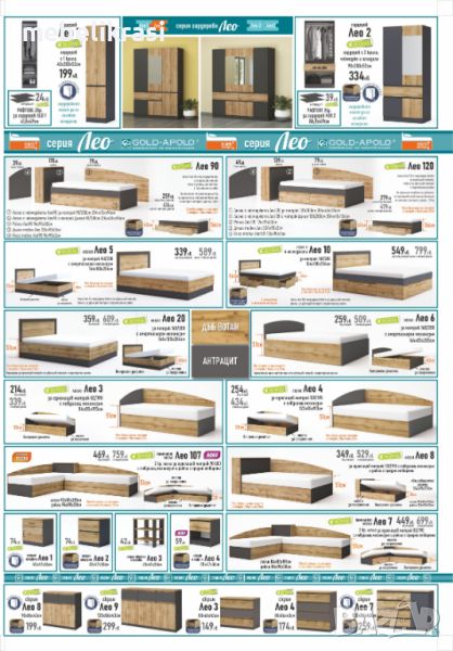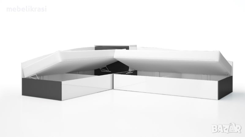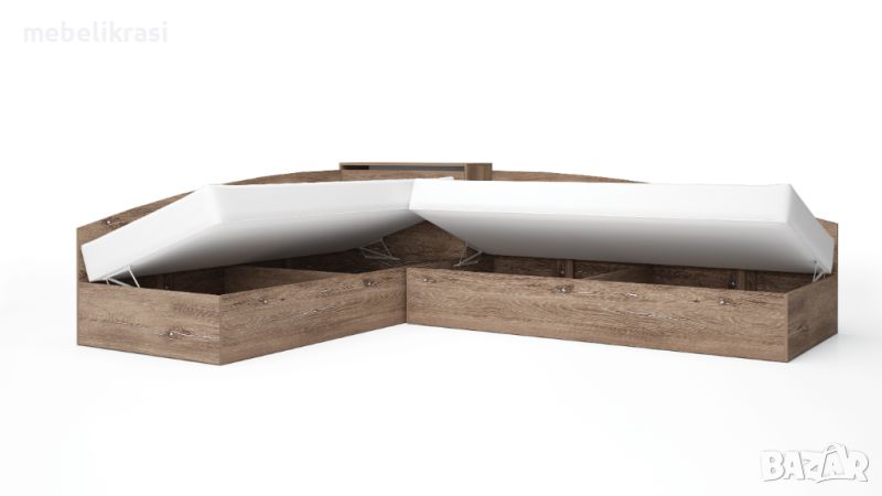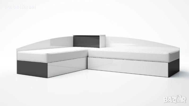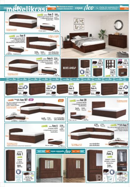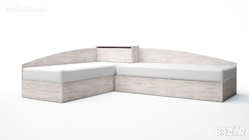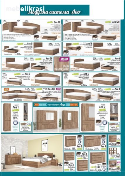 Ъглови легла "Лео 7" са оборудвани с: матраци, ракла с предно отваряне и повдигащи механизми, разкриващи подматрачни пространства с делител. Изработват се в цвят по избор.