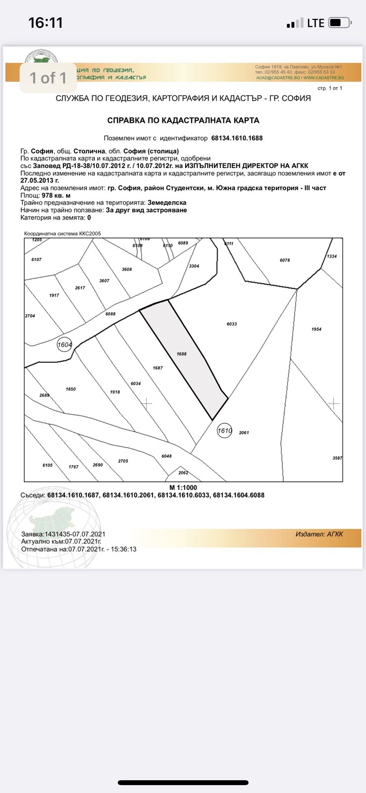 Поземлен имот със статут на земеделска земя,с идентификатор 68134.1610.1688,район Студентски,местност Южна градска територия-трета част,между Малинова долина и Младост 2.Района е много перспективен.Инвестицията си заслужава.Подходящ за спортни съоръжения.За информация-Елена Цветанова-0889295954
