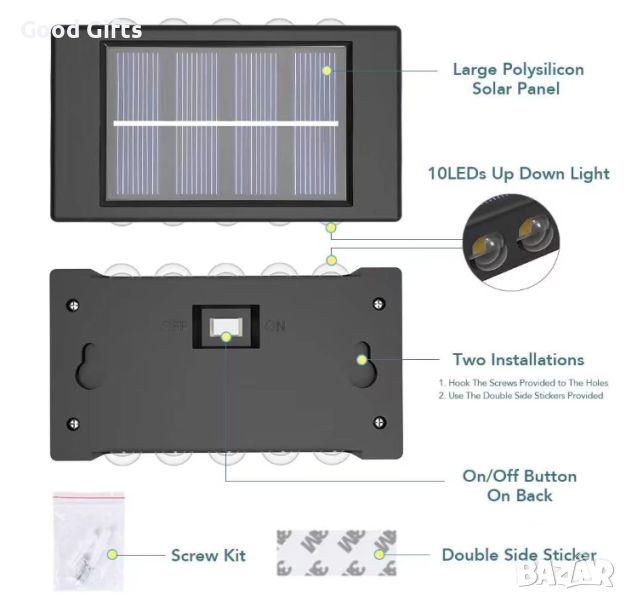 LED Соларна лампа за стена, Двупосочна