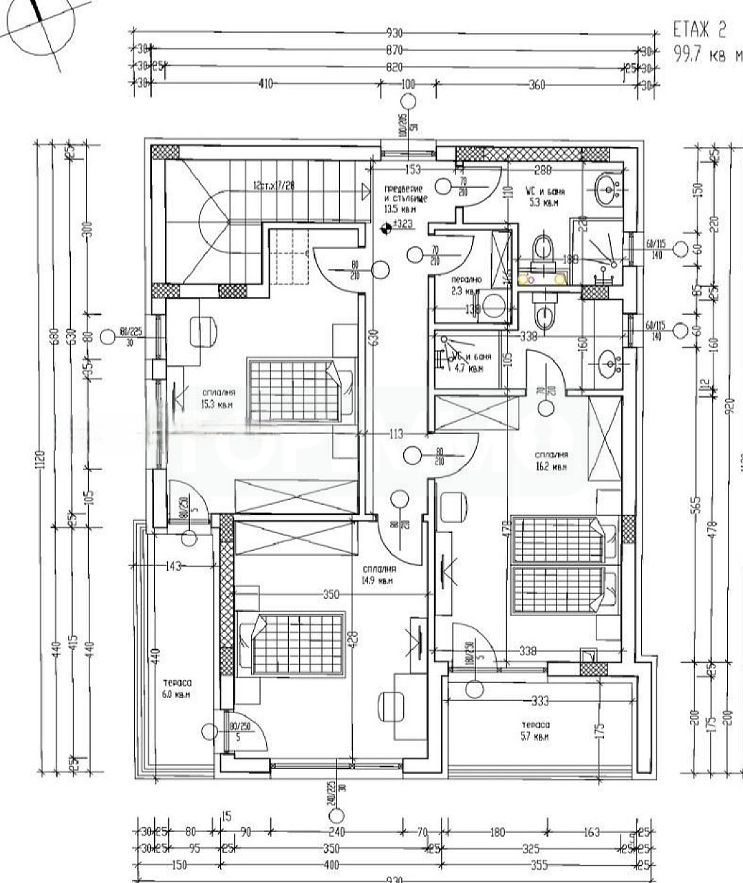Втори етаж със застроена площ 99.7 кв.м.: коридор, родителска спалня (16.2 кв.м.) със собствен санитарен възел (4.7 кв.м.) и тераса (5.7 кв.м.), втора спалня (15.3 кв.м), трета спалня (14.9 кв.м.) втори санитарен възел (5.3 кв.м.), втора тераса към двете спални (6 кв.м.), перално помещение (2.3 кв.м.).