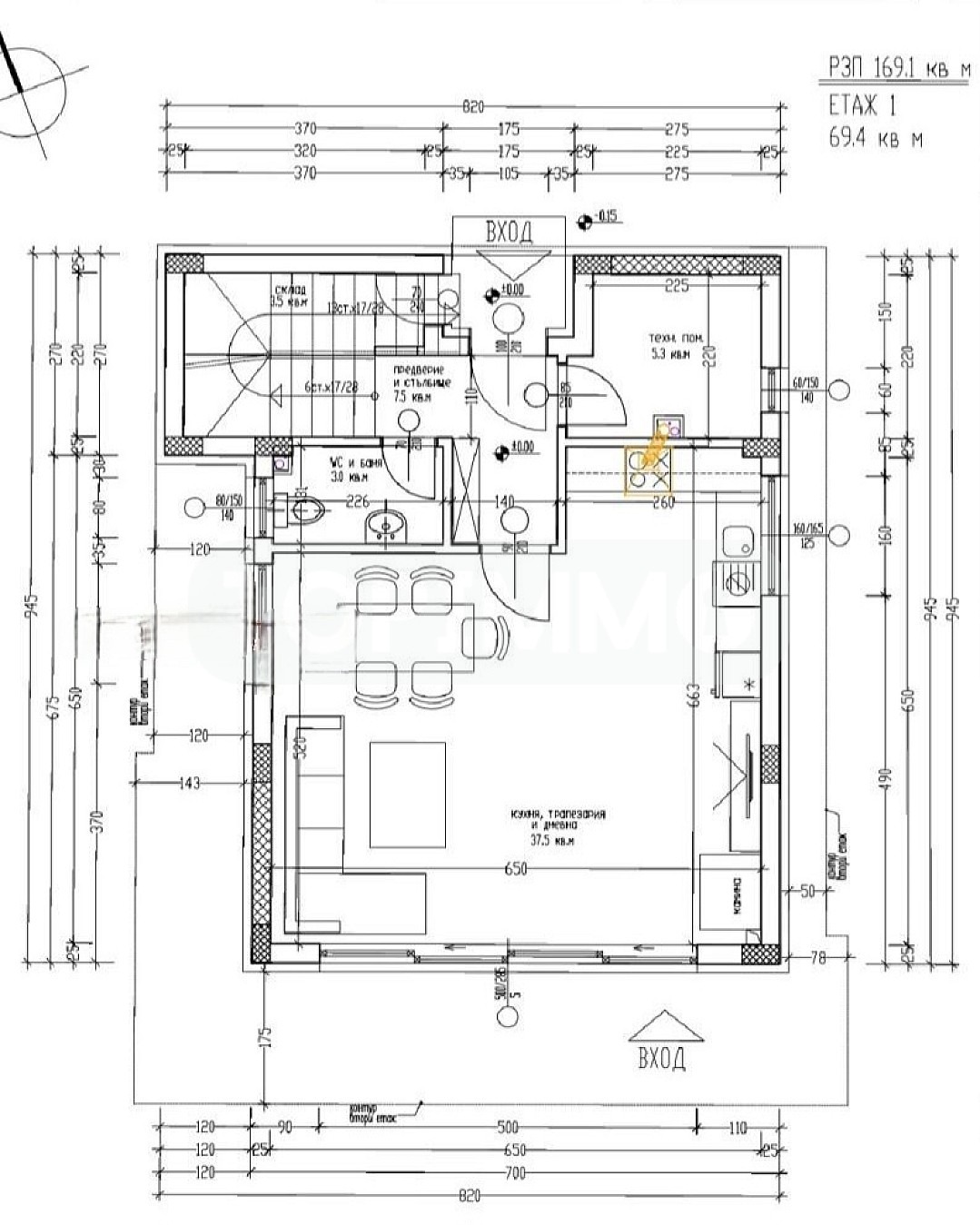 Първи етаж със застроена площ 69.4 кв.м.: входно антре и стълбище към втори етаж (7.5 кв.м), просторна дневна с кухненски бокс и трапезария (37.5 кв.м) с излаз на веранда (15 кв.м.), санитарен възел (3 кв.м), килер (5.3 кв.м), складово помещение (3.5 кв.м);