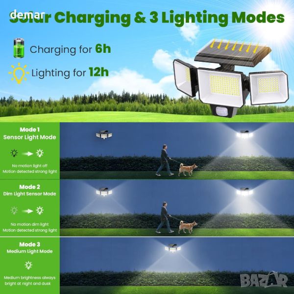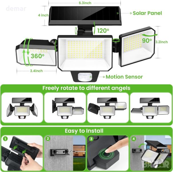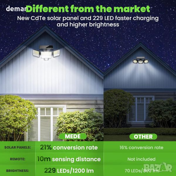 MEDE 229 LED ултра ярка външна слънчева светлина осигурява 1200 LM осветление с три регулируеми глави, предлагащи широк ъгъл на осветяване от 270°. Той е по-ярък от повечето налични соларни LED лампи 72/108/138. Отличаващ се със сензор за движение с висока чувствителност с обхват 32FT/10M и ъгъл от 120°, той има три режима на осветяване: режим на сензорна светлина, режим на сензор за слаба светлина и режим на средна светлина, което позволява лесно персонализиране. Модернизираният слънчев панел CdTe осигурява 5% по-висок процент на преобразуване, осигурявайки ефективно зареждане дори при неблагоприятно време. Тази водоустойчива лампа IP65, изработена от издръжлив ABS материал, издържа на екстремни условия, което я прави идеална за всяко външно пространство. Лесен за инсталиране, той се предлага със скоба за стена