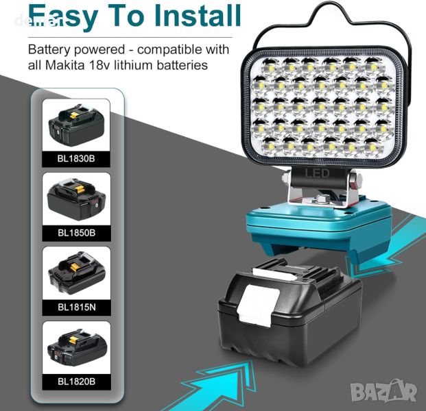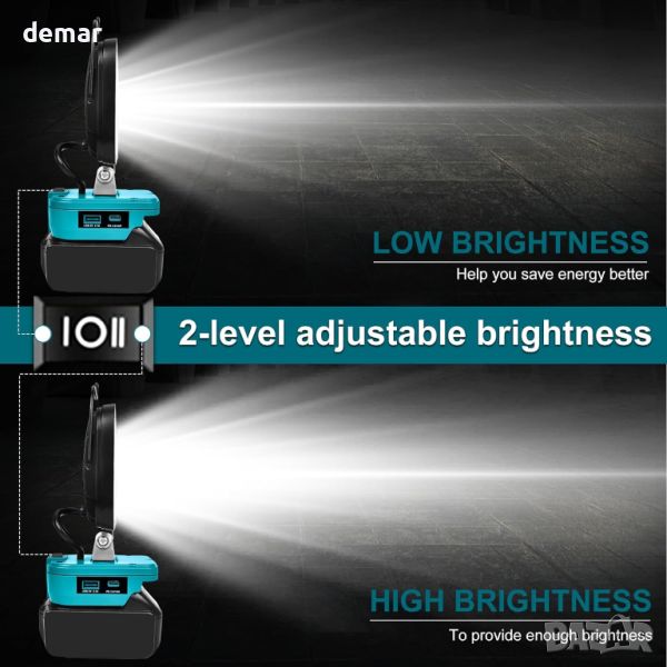 Тази безжична работна лампа е съвместима с Makita BL1815 BL1830 BL1840 BL1850 BL1860 BL1830B BL1850B BL1860B и т.н. и разполага с въртяща се на 140° глава за прецизно осветяване. Той предлага супер ярко, енергоспестяващо осветление с два регулируеми режима и двойни портове за зареждане (Type-C и USB) за зареждане на различни устройства. Компактният, преносим дизайн включва удебелена алуминиева обвивка и IP67 водоустойчив абажур за издръжливост, изискана кука за лесно окачване и вградена защита от ниско напрежение за безопасност на батерията. Идеален за малки пространства, работни площадки или употреба на открито, идеален е за магазини, складове, ремонти на автомобили и др. [Батерията не е включена]