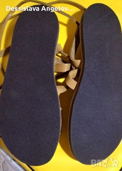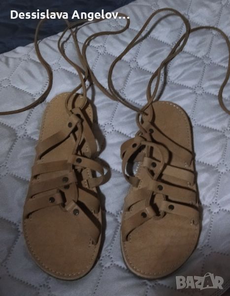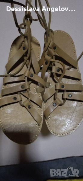 Римски дамски сандали от естествена кожа с връзки -въжета, опасващи крака по дължината му, в цвят "канап". 38-ми номер, в отлично състояние, само пробвани,с повърхностна козметична незабележима драскотина на едната (снимана е). Като нови!