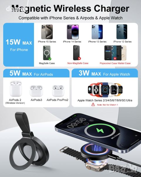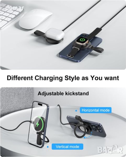Това иновативно магнитно зарядно устройство предлага едновременно зареждане за iPhone, AirPods и Apple Watch, съвместимо със серия iPhone 15/14/13/12, серия Apple Watch Ultra/SE/9 до 2 и AirPods 2, 3 и Pro. Силните магнити позволяват моментално зареждане за 1 секунда, с автоматично подравняване за ефективно зареждане. Той също така функционира като стойка и ръкохватка за телефон, регулируема от 0° до 120°, осигурявайки използване със свободни ръце в пейзажен и портретен режим. Изработен от първокласна алуминиева сплав, пръстенът е здрав и издръжлив, с подвижен 1 метър USB C към C кабел за преносимост. Сертифициран за безопасност с CE, FCC и RoHS, той включва защита от прегряване, презареждане, пренапрежение и свръхток. Пакетът включва магнитно безжично зарядно устройство, USB C към C кабел и ръководство за потребителя (адаптер не е включен). Идеален за дома, офиса или пътуване, той е идеален подарък.