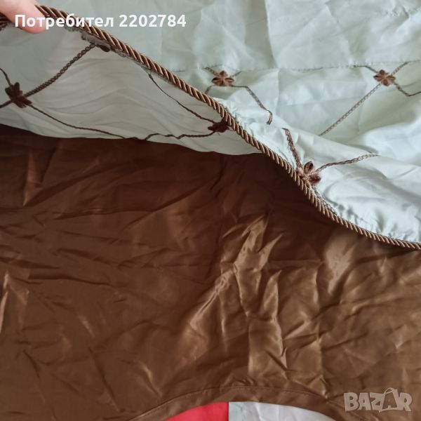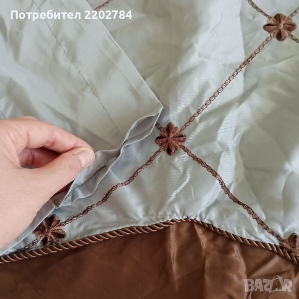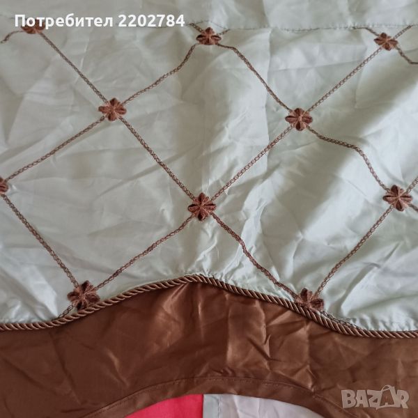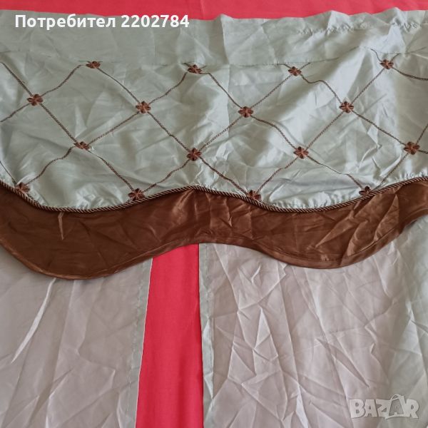 Горната част е много красива - две допълнителни парчета органза в основния цвят на пердето,който не мога да определя точно (нещо светло сиво с няколко капки каки) и в допълнение шоколадено кафяво в горната част.В кафяво са и красивите бродерии и копринените ширити,с които е обточено.Стои много красиво.