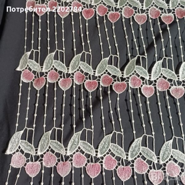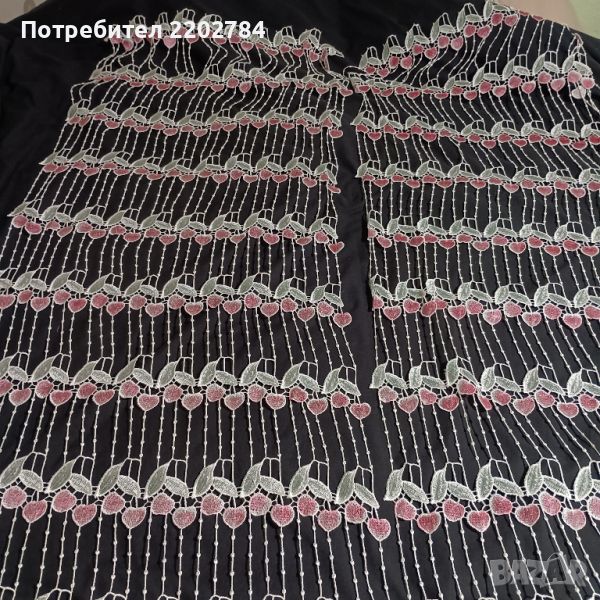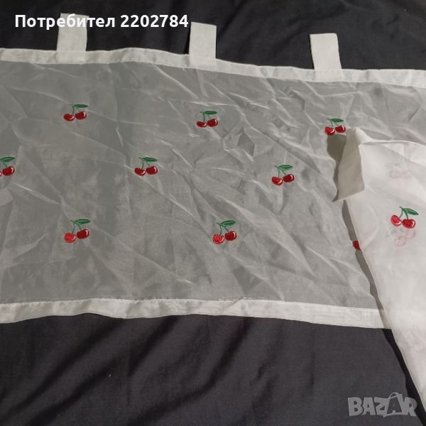 Вторите пердета са много интересни.Слагат се само за красота,защото са изработени само от тънки ширити и твърди бродерии на черешки.Падат тежко.Размери на едното: ширина 52см, дължина 185см.Два броя.Пердето за долната част на прозореца е също с черешки (45/180см) и е подарък към ,,черешовите" пердета.