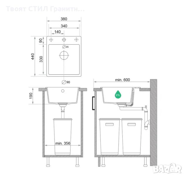 Линията "min. 356" показва необходимото пространство в мм за монтаж на мивката в шкафа !!!