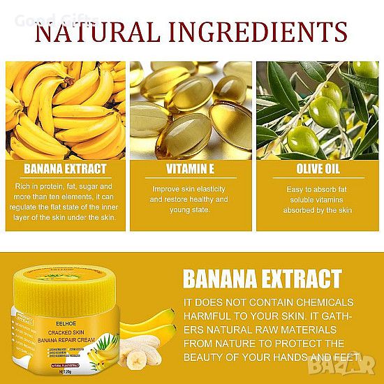 Кремът за крака и ръце е обогатен с бананов екстракт, който е богат на витамини и антиоксиданти. Това помага за защитата на кожата от вредните външни фактори и стимулира регенерирането на клетките на кожата. Кремът също така е обогатен с алое вера, която помага за увеличаване на хидратацията на кожата и създава защитен слой, който предпазва от дехидратация.