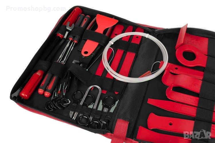 Комплект инструменти от 40 части - лостове, шини, шпатули, пластини, отвертки тип вилица(230мм и 306мм) за демонтаж и монтаж на авто аудио (радио, CD, мултимедия), кори, панели, плафони, табла, лайсни, говорители, тапицерии и други декоративни елементи на интериора и екстериора с цел улеснение и избягване на драскотини.