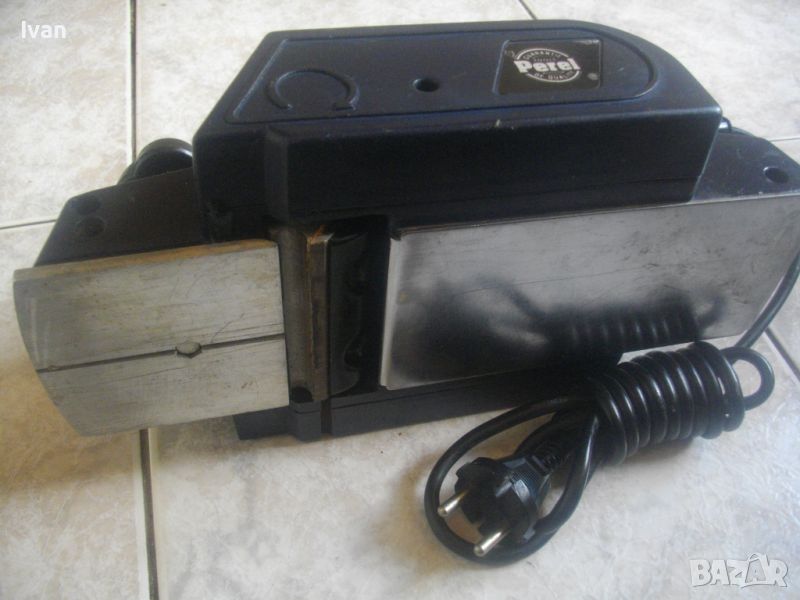 ОПИСАНИЕ на тъмно синьо ел. ренде. Почти ново мощно 600 ватово ел.ренде-ръчен абрихт.Френска марка и лиценз,Тюв сертификат. Производство не е упоменато.Година производство 1999 г.Марка и модел-Perel REF4740.