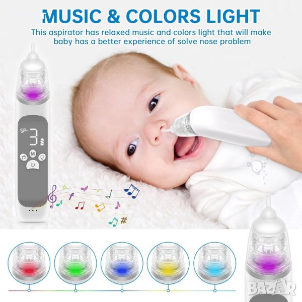 Бебешки назален аспиратор с 3 нива на засмукване, 3 накрайника за изсмукване на нос, музика