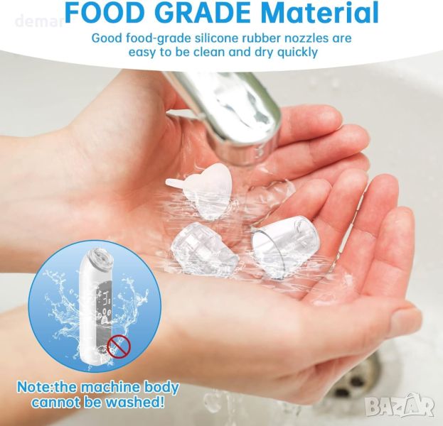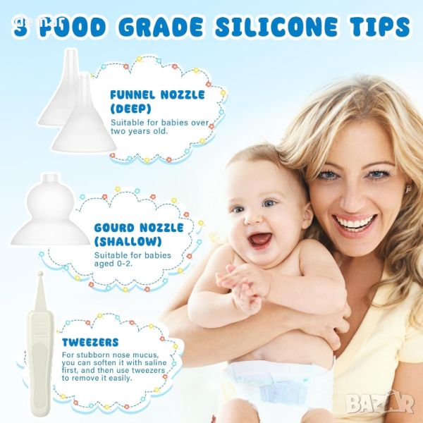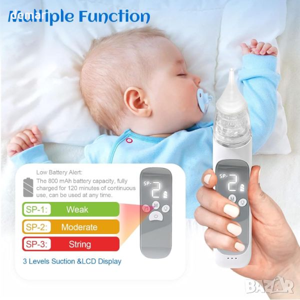Бебешкият назален аспиратор е електрическо изсмукване за нос, проектирано за лесна употреба с управление с един бутон и голям LCD екран за интуитивен контрол. Той включва персонализирани за възрастта силиконови накрайници, изработени от мек материал, за да се избегне натиск върху носната лигавица, включително три вида: заоблена форма за 0-2 години, малко по-дълбок плосък отвор за около 2 години и най-дълбокият скосен отвор за бебета над 2 години. Устройството предлага три регулируеми режима на засмукване с нива, вариращи от 55Kpa до 68Kpa, подходящи за новородени, бебета или малки деца. Работейки тихо при по-малко от 65 dB, той включва 10 музикални и светлинни функции за успокояване и разсейване на бебето, правейки изживяването нежно и без стрес. Дизайнът на преносимата кутия за съхранение позволява лесен транспорт, с акумулаторна батерия, която издържа 2-3 часа с едно зареждане, достатъчна за около 20 употреби. Пакетът включва основното тяло, USB-C кабел за зареждане и силиконови накрайници за удобна употреба в движение.