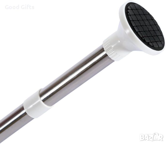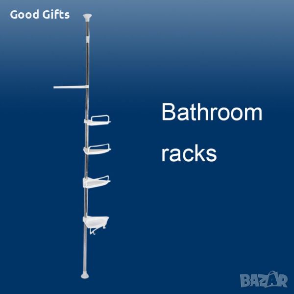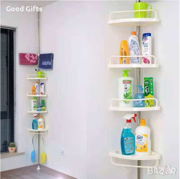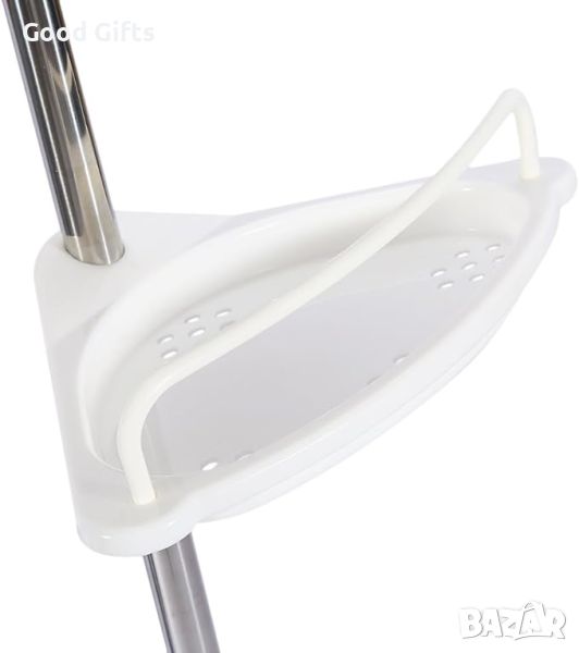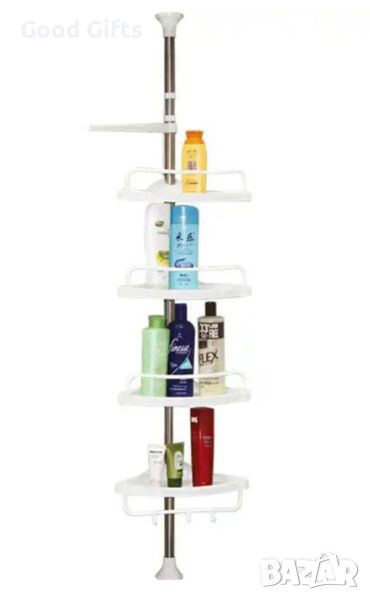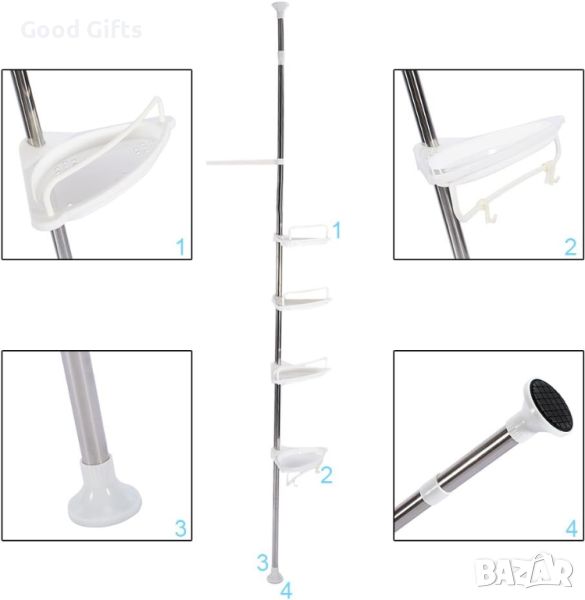 Неговото просто телескопично, пружинирано, завъртащо и заключващо действие приляга добре в ъгъла на вашия душ (от пода до тавана) или ваната (ръб на вана до тавана) за секунди. Стълбът е от метал, а рафтовете са изработени от трайна пластмаса, с четири много удобни 33,5 см пластмасови рафта, които лесно се монтират бели, устойчиви на ръжда материали. Устойчиви, дълготрайни материали няма да ръждясват или обезцветяват. Не са необходими инструменти. Прътът се простира до тавани от 6 до 9 фута