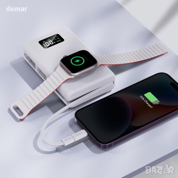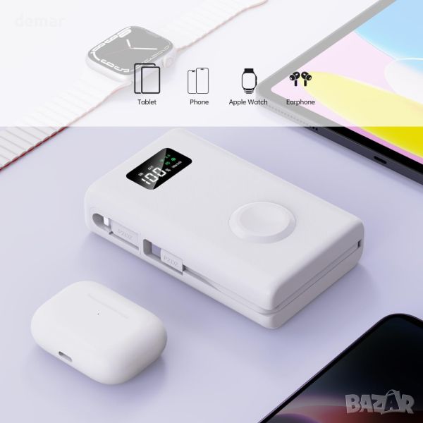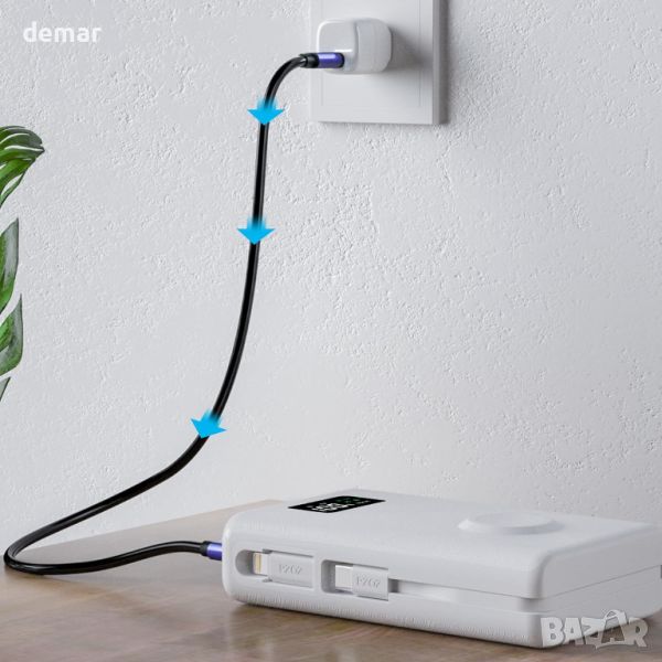20000mAh захранваща банка разполага с впечатляваща скорост на зареждане до 22,5W, зареждайки iPhone 14 до 60% само за 30 минути. Той поддържа PD2.0/PD3.0/QC3.0/SCP/FCP протоколи, позволявайки бързо зареждане за множество устройства едновременно чрез вградени кабели, USB-C (вход/изход), USB-A (изход) и 18W Lightning (вход) порт. LED цифров дисплей показва заряда на батерията и състоянието на зареждане на устройството. Той е компактен (120х75х30 мм), лек (360 г) и отговаря на международните стандарти за въздушен транспорт за лесно пренасяне. Натиснете бутона за превключване, за да активирате изход за ниско напрежение за зареждане на Apple Watch и AirPods.