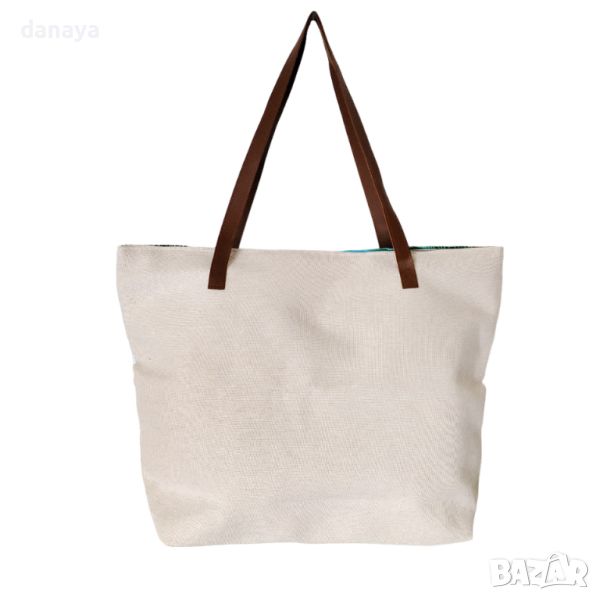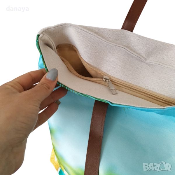 Голяма плажна чанта с принт на плажни аксесоари. Чантата може да побере всичко необходимо за плаж. Здрави кожени дръжки. Изработена от здрав плат, затваря се с цип. Във вътрешната си страна има малко джобче за поставяне на телефон или други малки аксесоари.