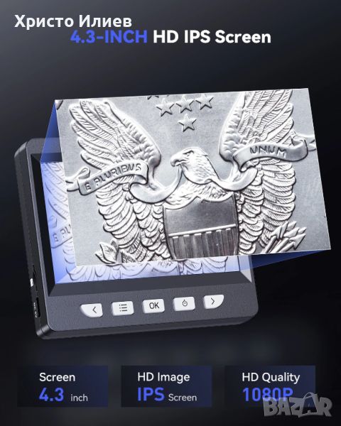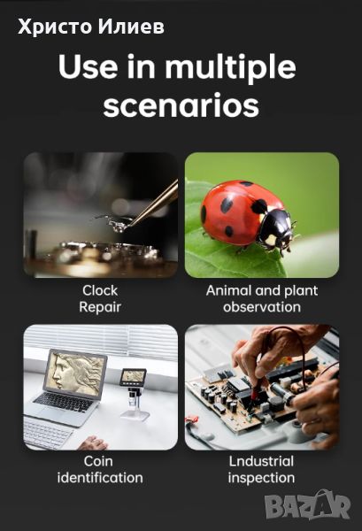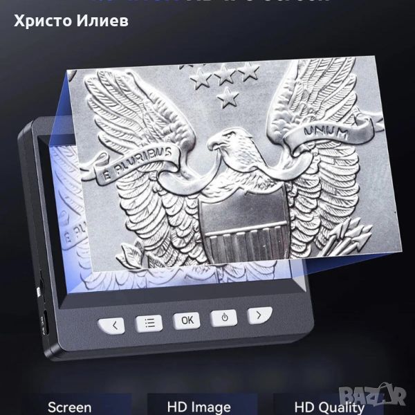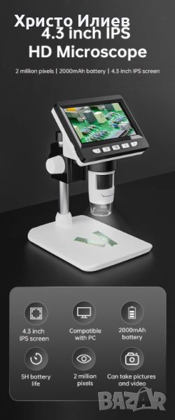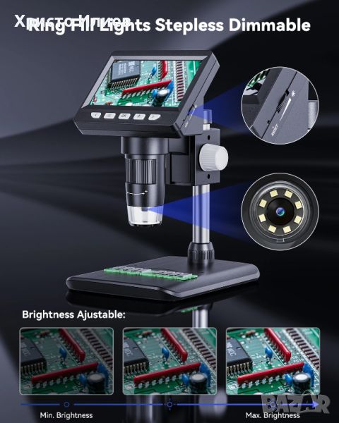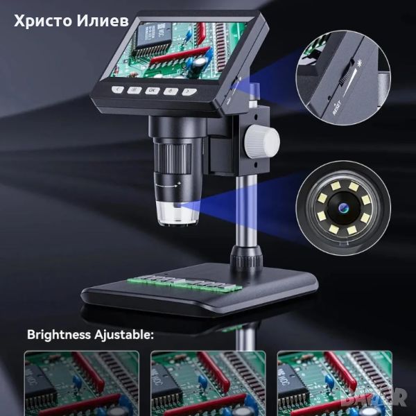Запис и възпроизвеждане на снимки и видеоклипове - видеомикроскопът е не само микроскоп, но и камера, която позволява да правите снимки и видеоклипове. Снимките и видеоклиповете ще бъдат запазени в micro SD картата и ще могат да се гледат на екрана на микроскопа или компютъра. (Максимална поддръжка на 32GB micro SD карта. SD картата не е включена.)