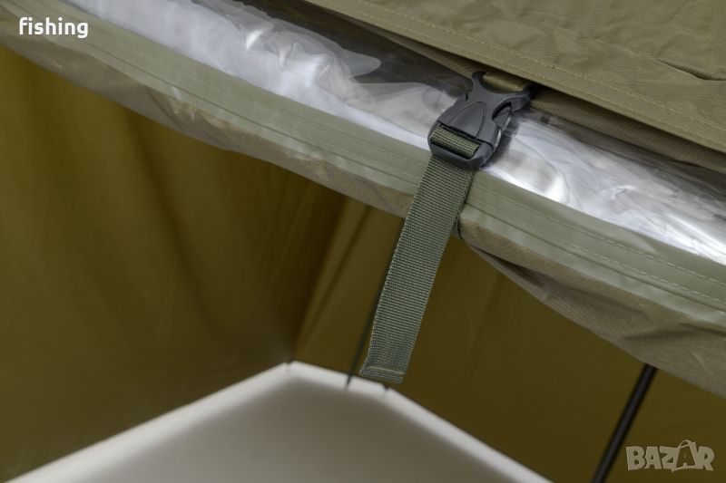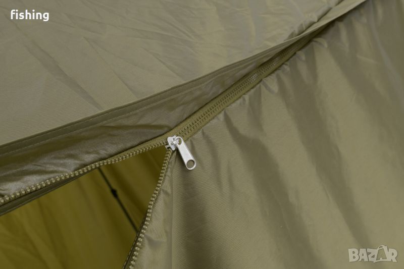 Напълно покрит чадър с квадратна форма и с включени страници, с гигантски размери. Може да побере два големи легла. Размерите на чадъра са напълно съобразени с дизайна и използваните материали. Рамката е изработена от здрави и гъвкави ребра от фибростъкло, които в допълнение към високата твърдост и стабилност осигуряват голяма издръжливост. Това е особено ценно при силни ветрове, когато стандартните телени ребра ще бъдат деформирани или напълно унищожени. Висококачественият найлонов сенник предлага много ниско тегло, безкомпромисен воден стълб от 8000 mm и напълно залепени шевове. Страничният панел е прикрепен отвсякъде със здрав цип, покрит с ръб против пропускане на вода. Предният панел с голям прозорец може лесно да се разкопчае и навие. При ветровити условия чадърът може да се стабилизира с помощта на четири закрепващи въжета. Този чадър се предлага с набор от издръжливи колчета за бивак за перфектно закрепване дори при трудни условия.