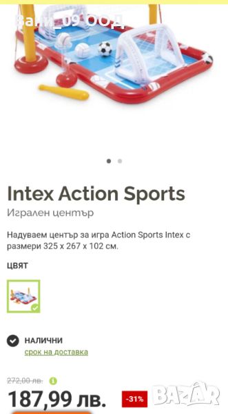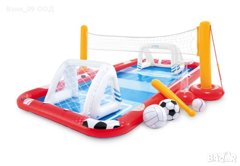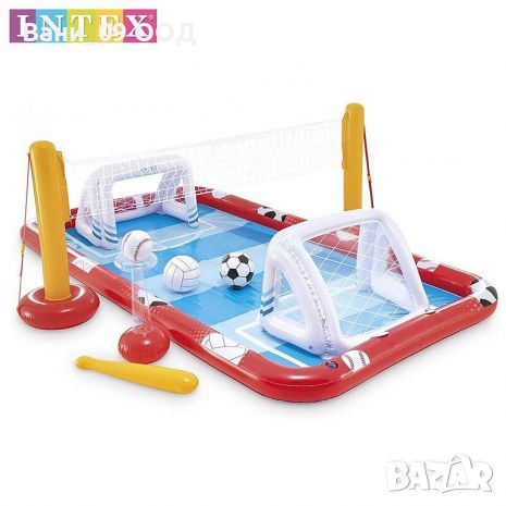 Центърът за игра Action Sports от Intex предлага много спортни забавления. Центърът за игра предлага широка гама от възможности и игри, с които децата да се забавляват в градината. Надуваемите играчки и оборудване на Intex отговарят на строги стандарти за безопасност за обработка и използвани материали. Конструкцията е изработена от издръжлив винил с обем 470 литра при височина на повърхността 23 см.