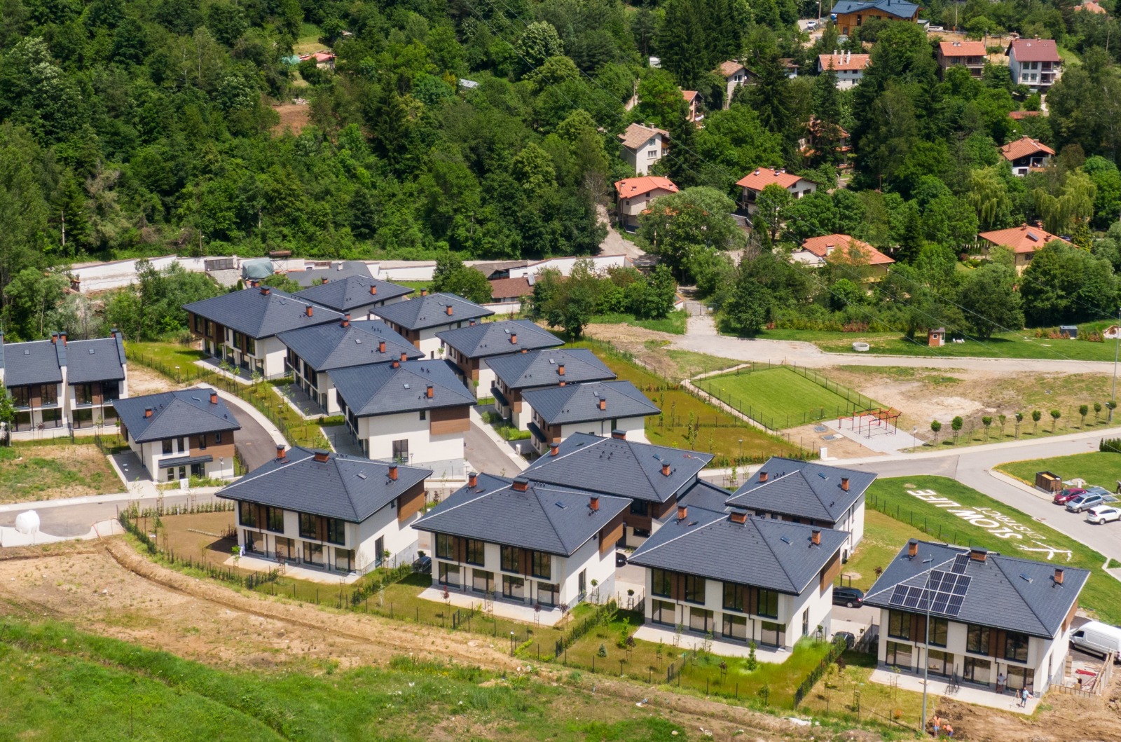 Къщите са разгърнати ветрилообразно, всяка една с изложение на всички жилищни помещения изцяло насочени и отворени към панорамата на Витоша.