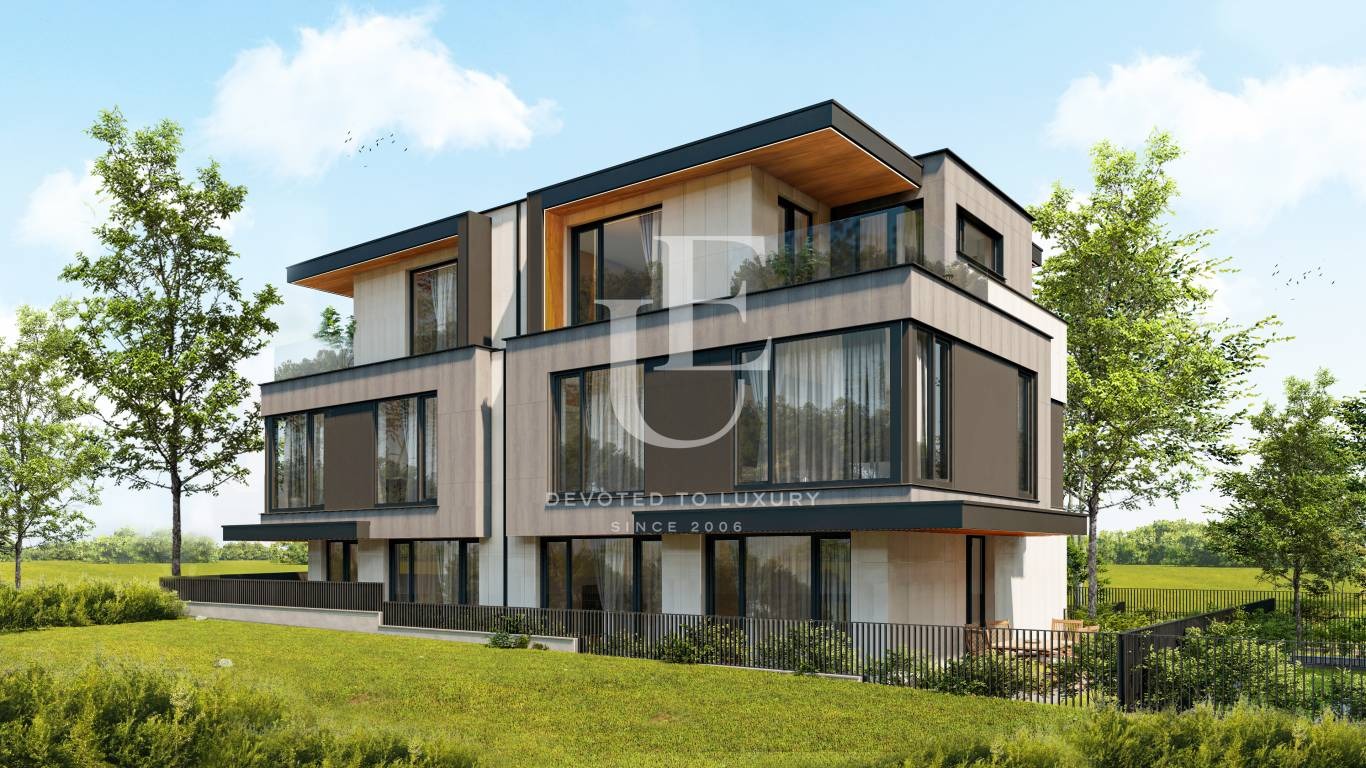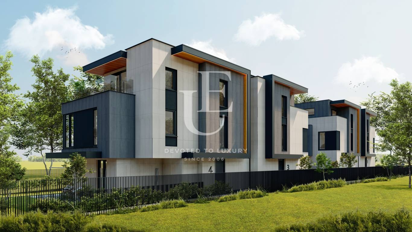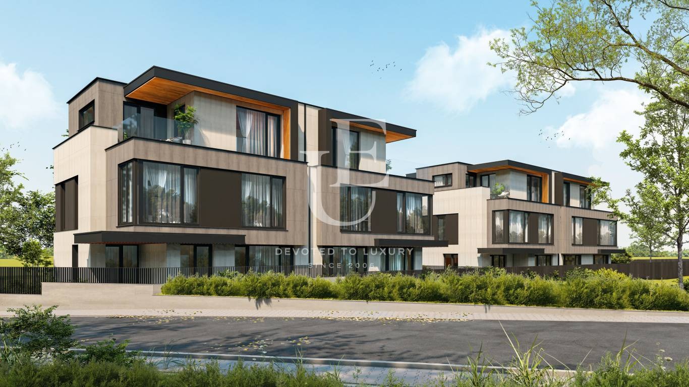 Паркинг изцяло в сутерен (двоен или троен гараж към всяка къща). Допълнителен двор за общо ползване от 400 кв.м. Отопление и охлаждане чрез термопомомпа. Трислоен стъклопакет. Фасада от керамични плочи.