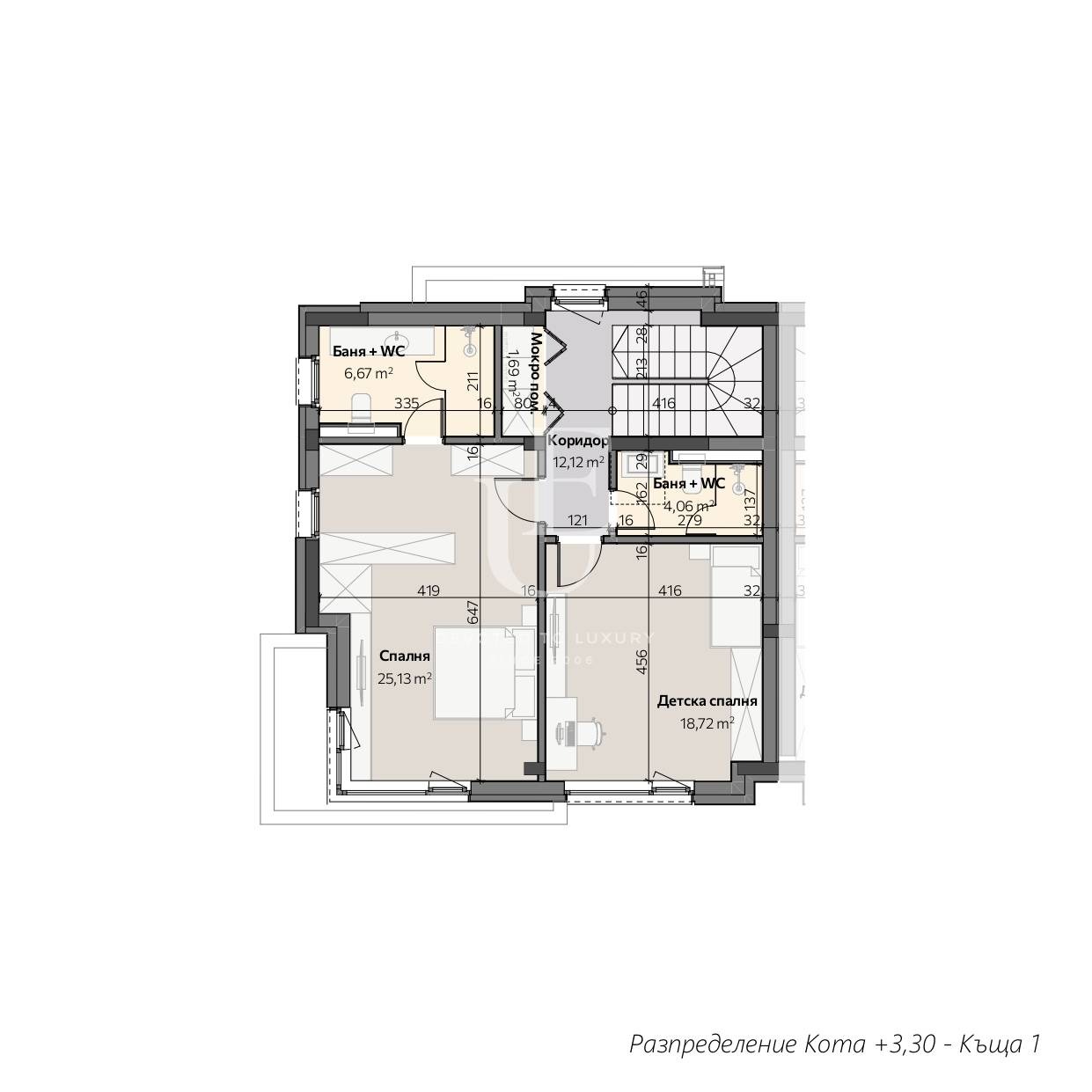 Второ и трето нива четири спални, като част от предвидените за спални помещения може да се обособят за кабинет, гостна, фитнес, библиотека или други тип помещения, съобразно нуждите на живущите.