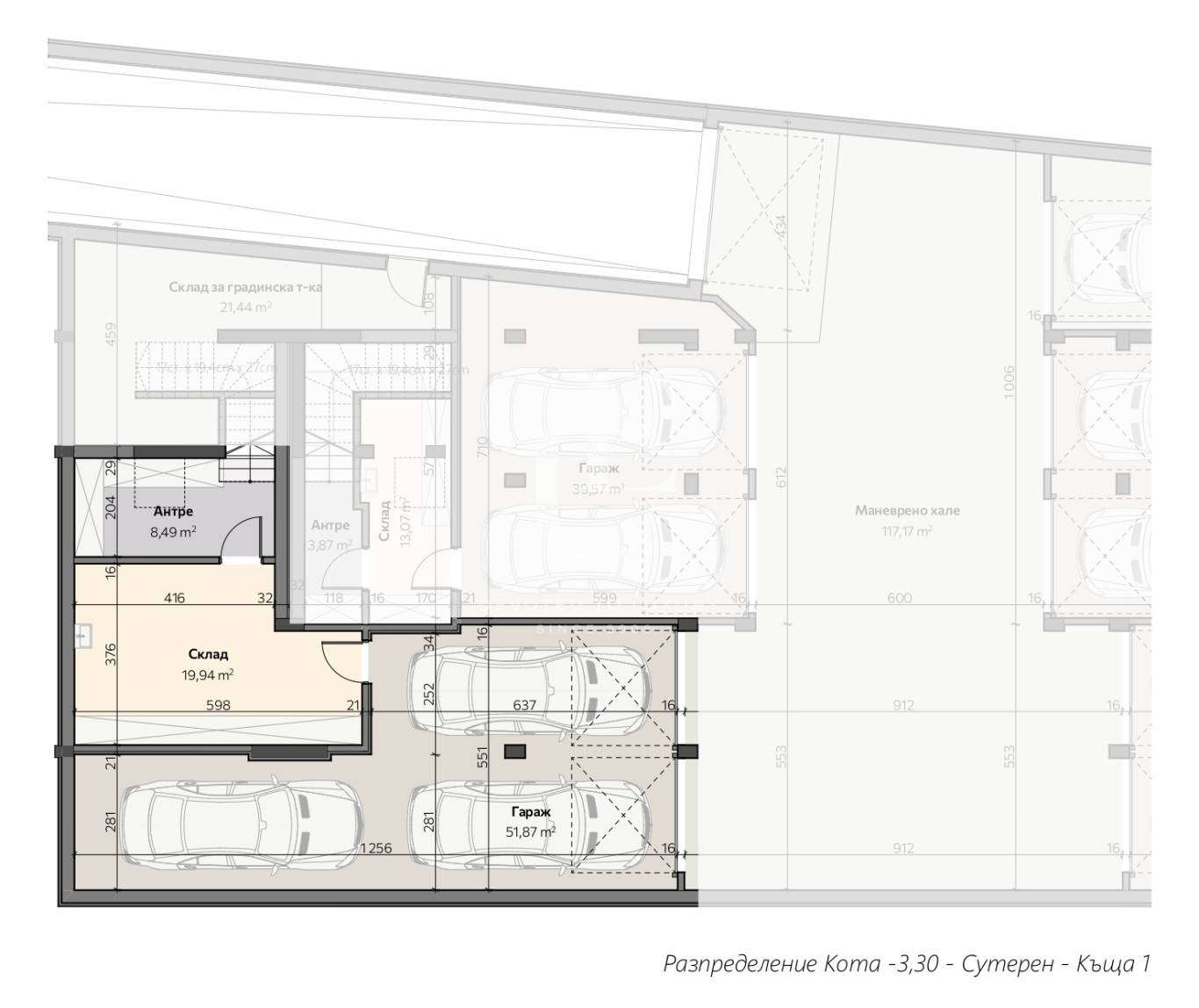 На първо ниво - склад, комфортна дневна с кухня и трапезария.