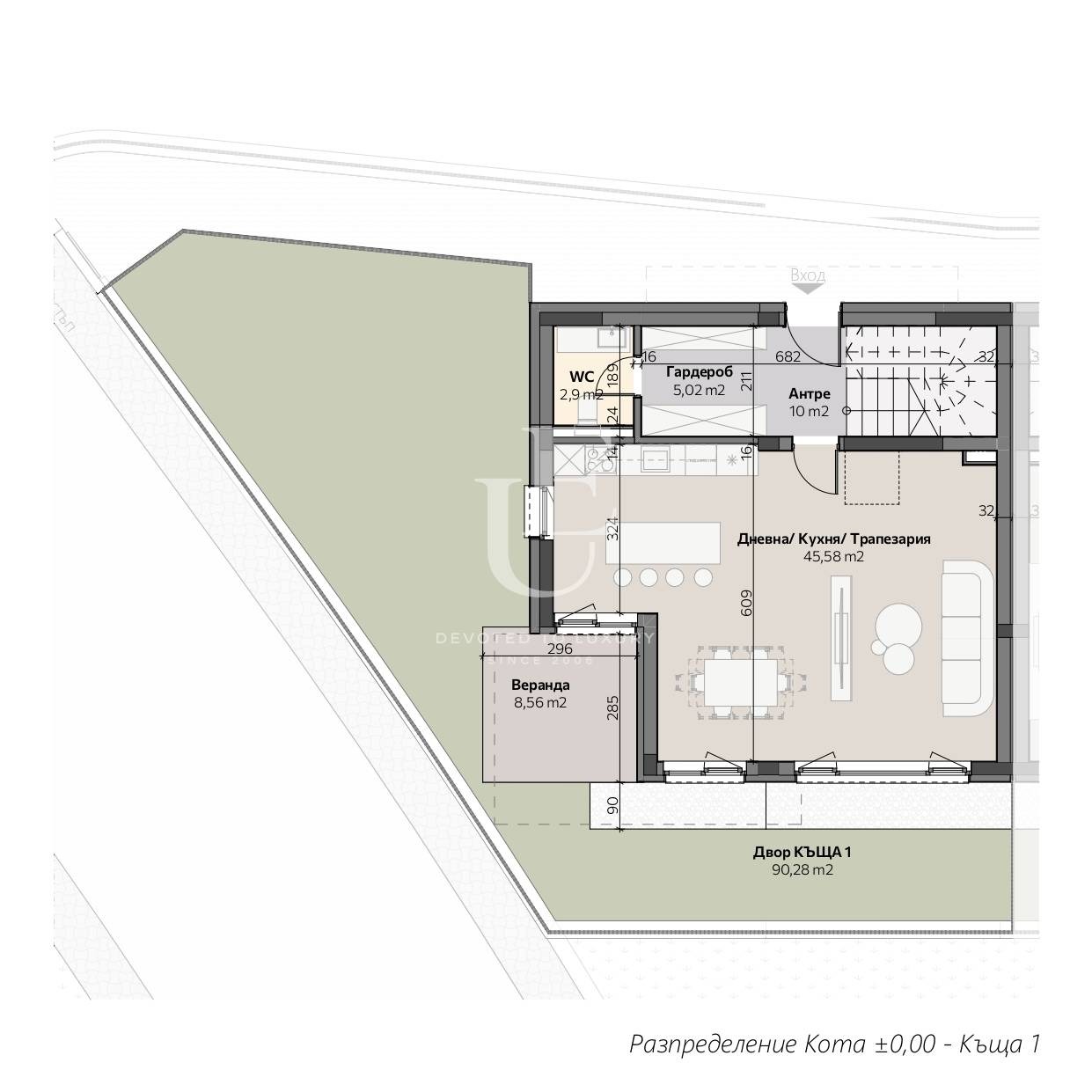 Къщата е проектирана така че да предостави оптимални разпределения без неизползваеми пространства, както и гъвкавост за обособяване на различни функции.