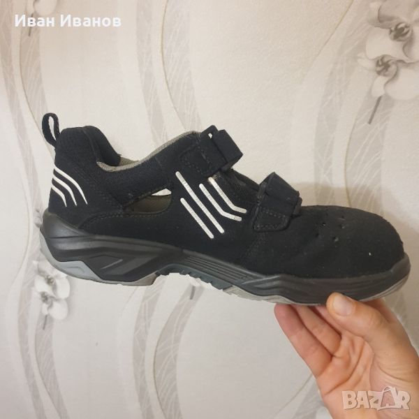 Използвани , Добро състояние .МикрофибъренДишаща текстилна подплатаПодплатен езикПълна стелка ESD PRO Поддържаща ESD стелка от мек полар с интегрирани изрезиTPU/PU подметка WELLMAXXПластмасова капачкаEN ISO 20345:2022 S1 FO/SR, форма AХарактеристики без метал и кожа, сърцевина на подметката, изработена от Infinergy® от BASFПредпазните сандали ETHAN Easy ESD S1 от ELTEN са истинска благословия през горещите летни месеци. Микрофибърната горна част и дишащата текстилна подплата ги правят много ефирни. Капачката на пръстите на този модел без метал и кожа е изработена от пластмаса. ESD-съвместимите предпазни обувки имат TPU/PU подметка, чиято сърцевина е оборудвана с Infinergy® от BASF. Материята осигурява оптимално омекотяване, защото пружинира при всяка стъпка. ETHAN Easy ESD S1 е изключително устойчив на приплъзване и е одобрен за ортопедични корекции съгласно EN ISO 20345 (DGUV 112-191). С практичните велкро закопчалки нищо не пречи на бързото и лесно поставяне!