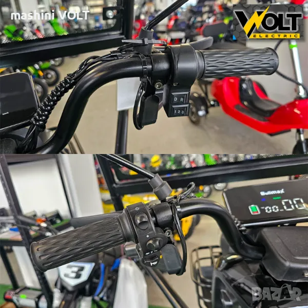 - Звукова + светлина аларма + механична съпротива при опит за кражба (триколката започва да буксува в противоположна посока)
