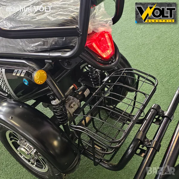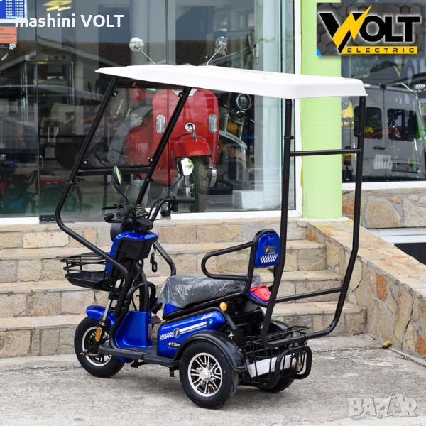 електрическа триколка с покрив и страници. Триколката е с мощен 1800W макс, безчетков двигател, задно задвижване с диференциал. Батериите са с капацитет 48V, 20Ah и осигуряват до 45км. пробег с едно зареждане. Триколката е с 3 скорости + задна скорост, максималната скорост е 35 км/ч. Има крачна спирачка, 2 ръчни спирачки, както и пълна LED светлинна окомплектовка. Оборудвана е с голям светещ LCD дисплей с показания за скорост, изминато разстояние, ниво на батерията и др. функционални показатели. Има предна и задна кошница, както и комплект огледала за обратно виждане. Покривната конструкция лесно се монтира и демонтира и осигурява лесен летен и зимен режим на ползване. Не е необходима регистрация в КАТ и шофьорска книжка. Триколката е предвидена за един или двама пасажери, като за втория са предвидени изскачащи странични степенки. Задно предаване, голяма мощност, изкачва големи наклони с товар без никакво усилие. 1200W номинална мощност на двигателя и 1800W максимална- повечето модели на пазара са с 600W реална мощност. Голям пробег от над 40 км, възможност за добавяне на 5-та батерия, за удължаване на пробега до над 60 км. Дистанционно управление, аларма, безконтактно палене. Увеличена максимална скорост в сравнение със стария модел от 25 на 35 км/час.