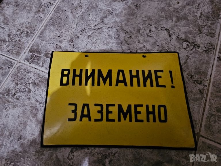 Рядка емайлирана табела ВНИМАНИЕ ЗАЗЕМЕНО, ОБЕЗОПАСЕНО от 70те години за твоята, фирма, сервиз или к