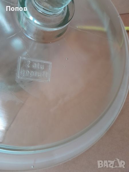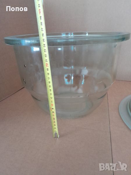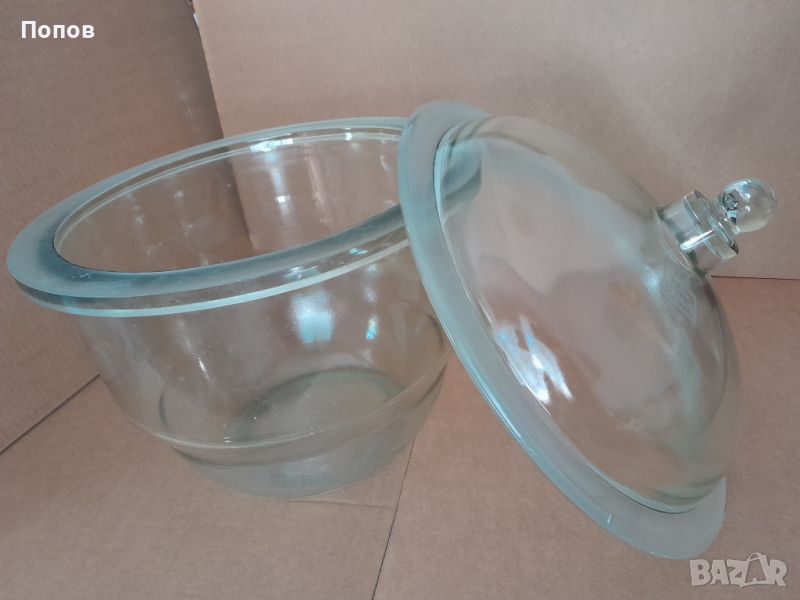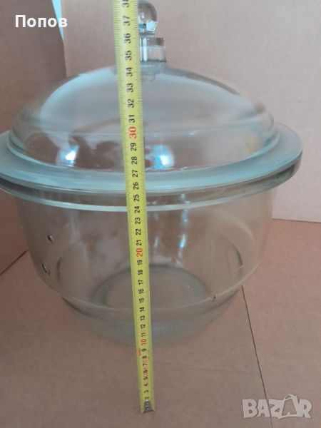 Голям стъклен ексикатор, (без кран и без керамична плоча), производство някогашната социалистическа ГДР, тежко масивно стъкло, не е ползван, вътрешен диаметър - 300мм, височина с капака, 420мм