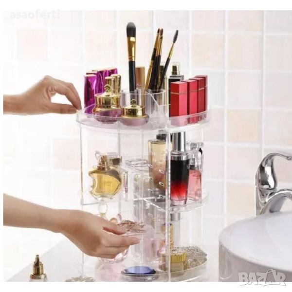 Органайзер за гримове , въртящ се на 360 градуса, ще ви впечатли със своята визия и професионално излъчване. Моделът е произведен от устойчив материал. Разполага с няколко рафта за поставяне на козметика и аксесоари за грим, а въртящата се основа ви дава лесен достъп до тях. Няма нужда да затрупвате тоалетката си с шишенца, тубички, четки, моливи и други гримове. Всичко може да бъде компактно и красиво събрано в този въртящ се органайзер за грим.