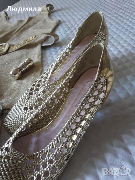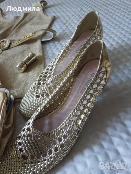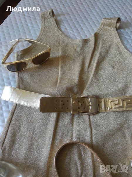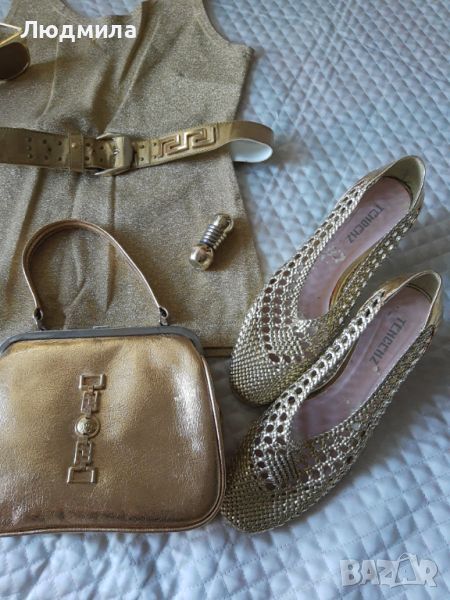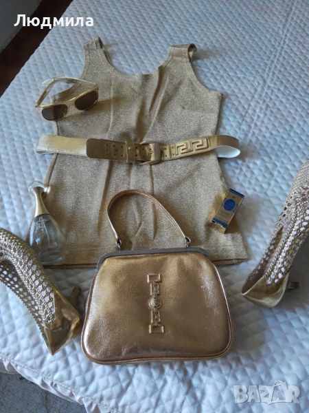 Продавам дамски златен комплект,потник ,еластичен,златна чанта Versace и златни обувки номер 40,колан златен Versace,и слънчеви златни очила.Комплекта се продава заедно