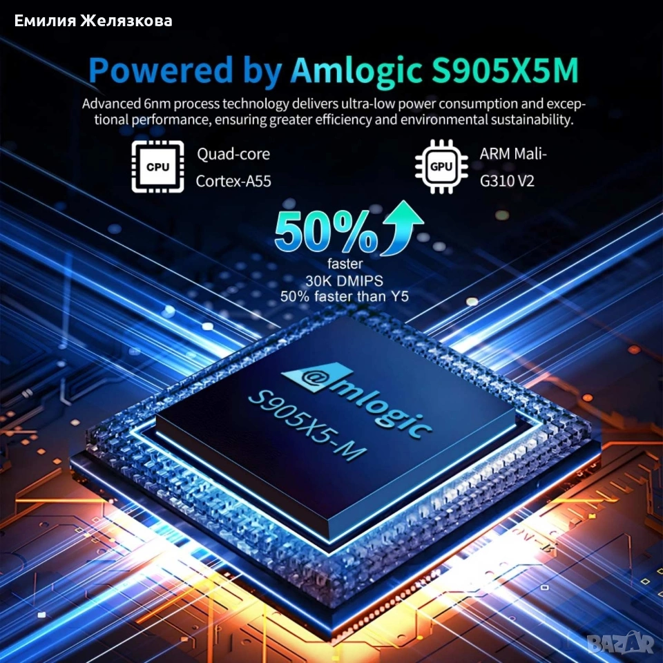 ТЕХНИЧЕСКИ ХАРАКТЕРИСТИКИ: CPU: Amlogic S905X5M (Cortex-A55, 6nm) GPU: Mali-G310 V2 RAM: 4GB DDR3 ROM: 64GB eMMC OS: Android 14 (Интерфейс на Български език) Интернет: Gigabit LAN (1000 Mbps) + Dual Band WiFi Екстри: Поддържа гласови команди и 8K декодиране. КАКВО ПОЛУЧАВАТЕ В КОМПЛЕКТА: ТВ Бокс X96 M200 Дистанционно с гласов контрол HDMI кабел Захранващ адаптер