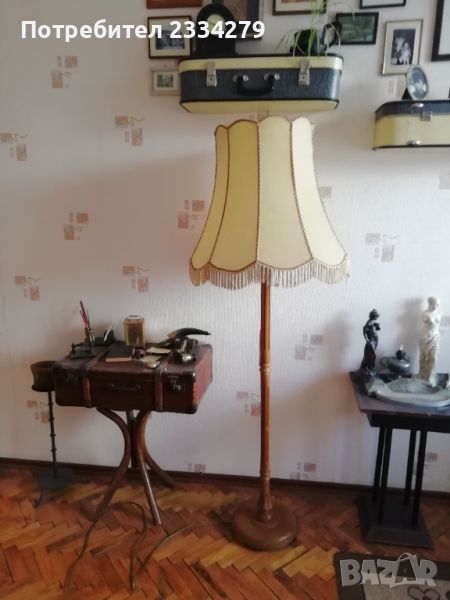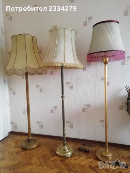 нощни лампи в стил,, БАРОК" високи с огромни КУПОЛИ. ЛЯВАТА: дървено орнаментирано тяло висока 1м.65см., купол: 57х50см., и с дърпащо се ключе за разсветване и 2 крушки, цена 70€. СРЕДНАТА: бронз и метал висока 1м.65см., купол от плат и ресни размери: 53Х45см., цена 50€. ДЯСНАТА: метална орнаментирана метална стойка, обща височина 1м.70см., купол от плат 47х43см.,метална фасунка с дърпащо се ключе за разсветване, цена 40€.