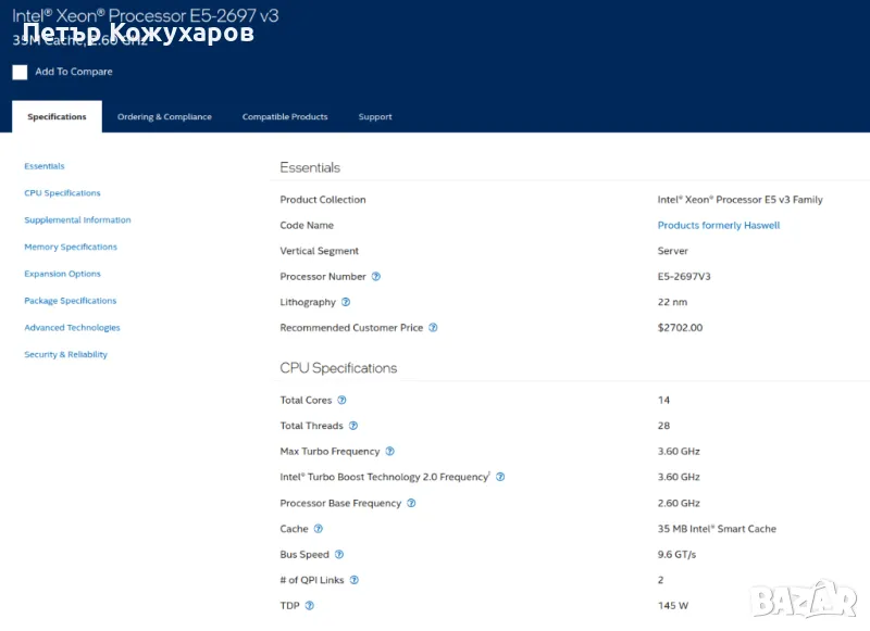 Процесор - Intel Xeon E5-2697 v3 - 14 cores/28 threads (2.6GHz-3.6GHz)