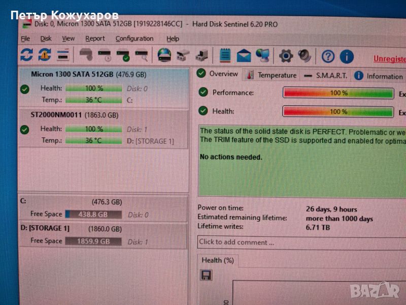 Преди около два месеца му добавих бърз 512GB NVMe диск, същият има още 57 месеца гаранция към Жар Компютърс. Резултатът от комбинирането на върхов процесор и бърз NVMe диск е невероятна скорост дори при работа с тежки приложения/игри. Мога да продам компютъра с него или без него - по ваш избор.
