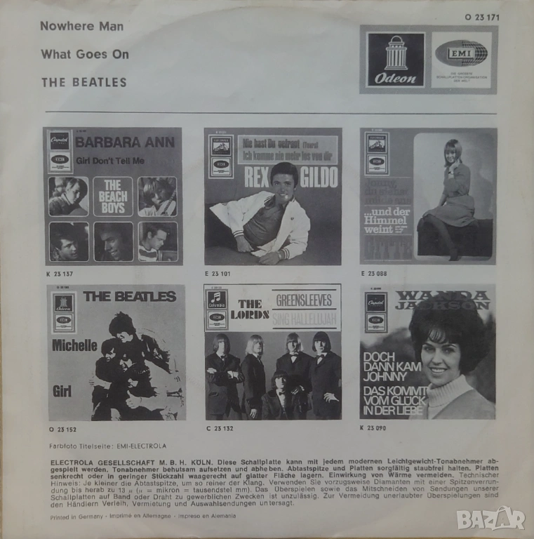 – 45-O-29 497, в добро състояние G+, с оригинална обложка.The Beatles – Nowhere Man / What Goes On 7" сингъл, първо германскоо издание 1966 г. Odeon – O 23 171, Odeon – 45-O-29 562 в много добро състояние VG, с правена обложка.