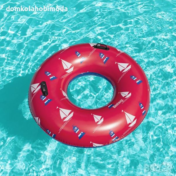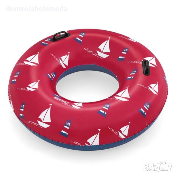 Надуваема пояс с диаметър 119 см . Със здрави дръжки и морски дизайн . Съдържа лепенки за ремонт.